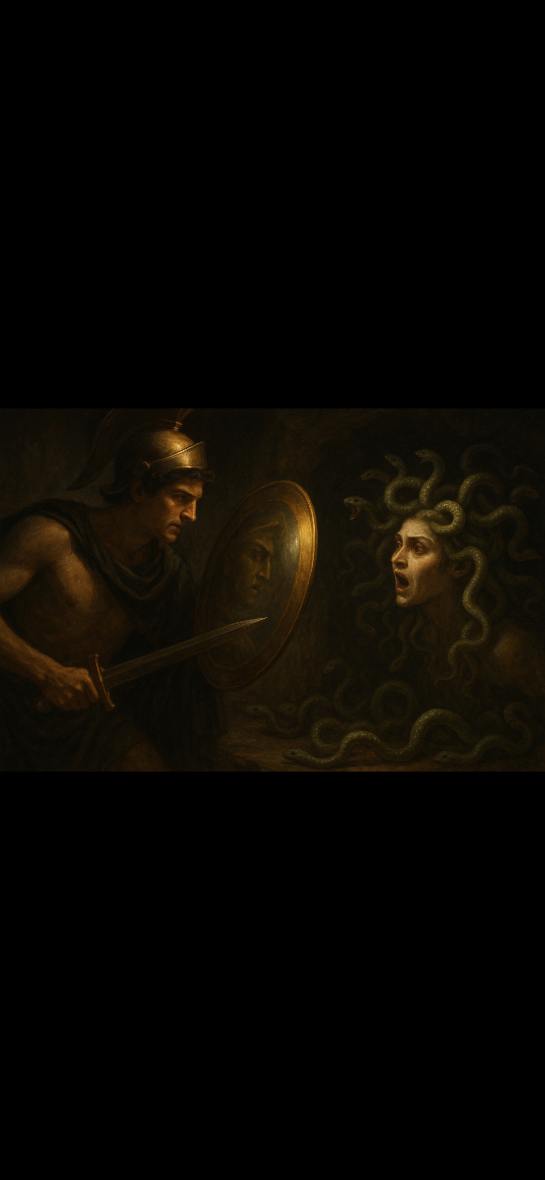 Bir dizi olayın ardından Medusa'nın mağarasına ulaşan Perseus, ona yaklaşırken gözlerini kaçırdı, kalkanın iç görüsünden yürüdü.