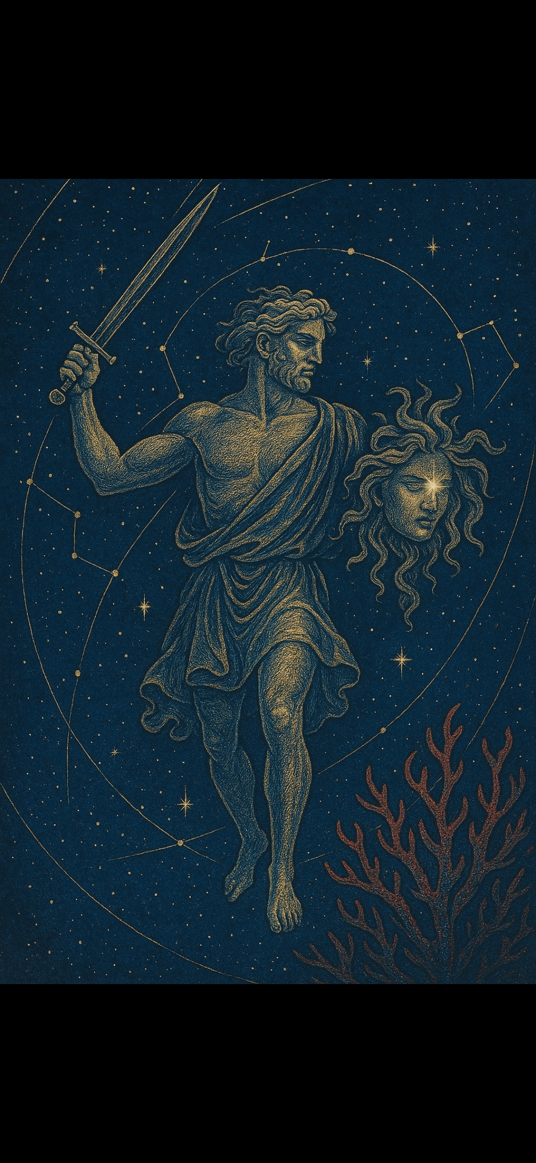 Medusa'nın denize akan kanı, su altındaki esnek bitkilere değdiğinde onları taşlaştırdı. İnce dallar kırmızıya dönüp sertleşti — ve yarım milyar yıldır var olan mercanlar, bu kanla hayat buldu.