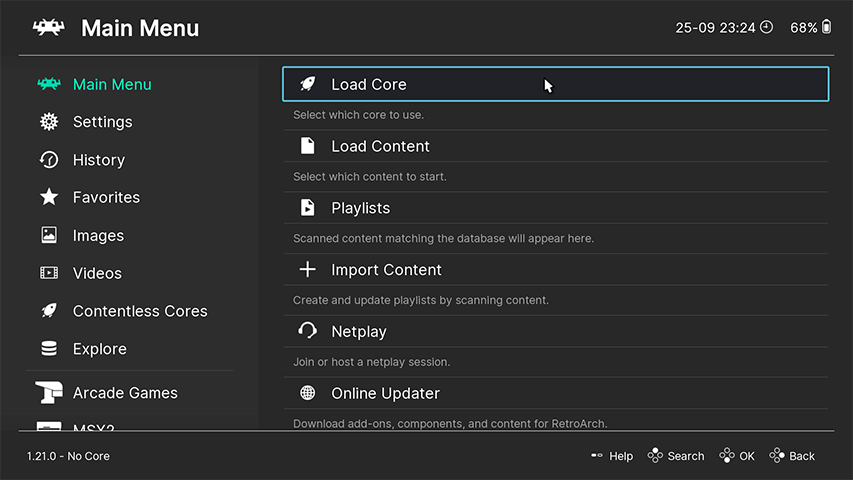 Ana Menüdeki "Çevrimiçi Güncelleyici" menüsünden kurulu çekirdekleri güncelleyebilirir, eğer RetroArch kontrolcünüzü tanımadıysa kontrolcü profillerini güncellemek gibi şeyleri yapabilirsiniz.