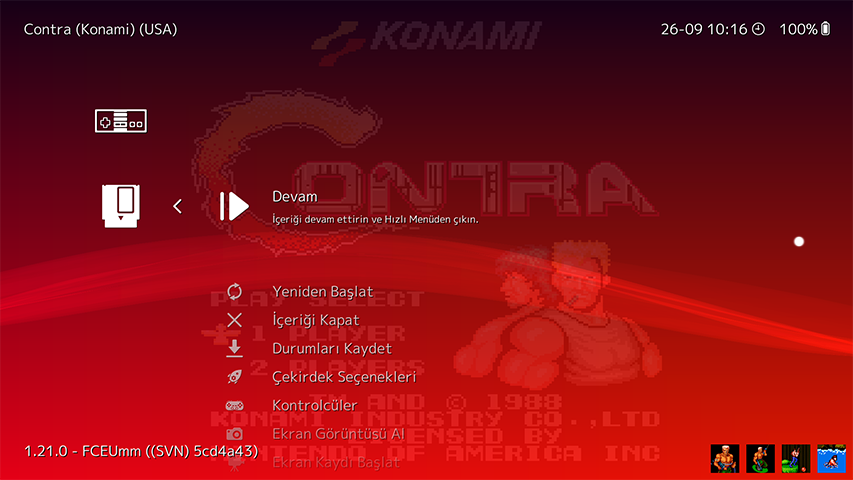 Oyunu çalıştırdıktan sonra F1'e veya varsa kontrolcünüzde home tuşuna bastığınızda sizi böyle bir menü karşılayacak. Bu menüden oyunla ilgili birçok işlemi yapabilirsiniz. Örneğin durum kaydı alarak oyunu istedinğiniz an kaydedebilir ve istediğiniz an o kayıda tekrar dönebilirsiniz. "Çekirdek Seçenekleri" seçeneğinden emülatör ile ilgili ayarlamaları yapabilirsiniz ama unutmayın bu RetroArch ayarları değil yüklediğiniz çekirdeğin ayarları. Oyun açık bi şekilde menüde gezinirseniz ana menüde "Hızlı Menü" adında bi seçenek göreceksiniz. O menü ile bu menü aynı hiçbir farkı yok kafanız karışmasın.
