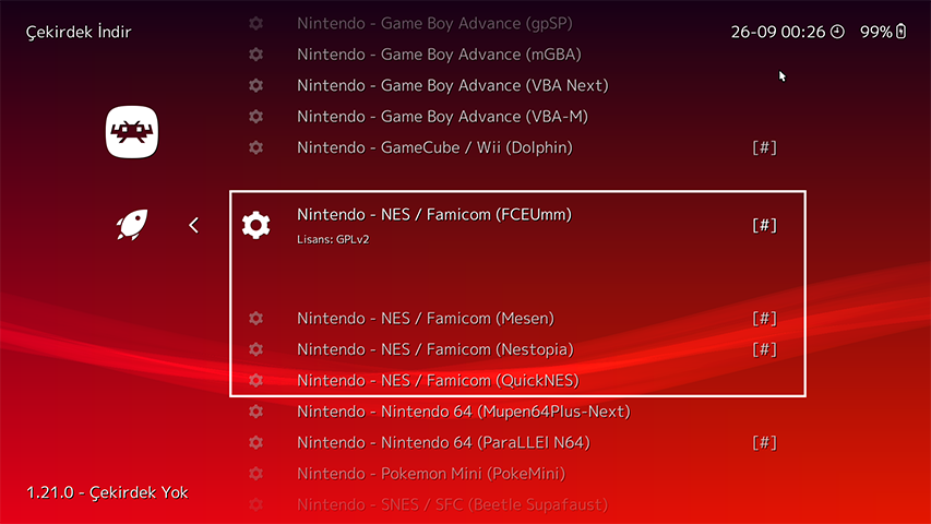 Bize lazım olan "çekirdekleri" indirmek için Çekirdek Yükle > Bir Çekirdeği İndir yolunu izliyoruz. Ama bazı durumlarda bir sistemin birden fazla emülatörü olabiliyor. Hangi emülatörü kullanacağımız bize kalıyor bu durumda.